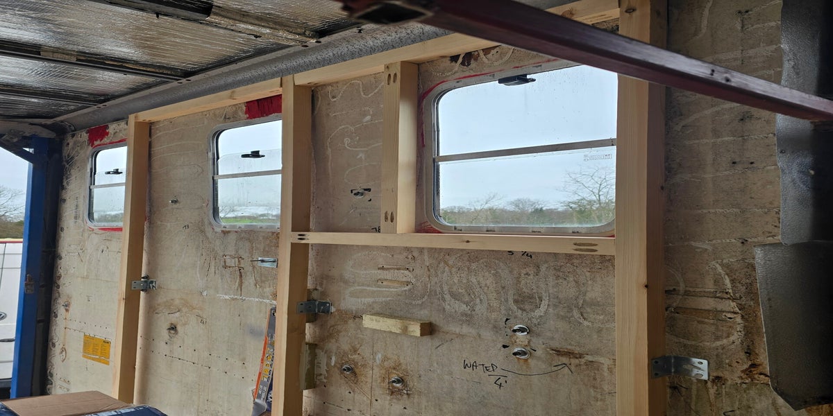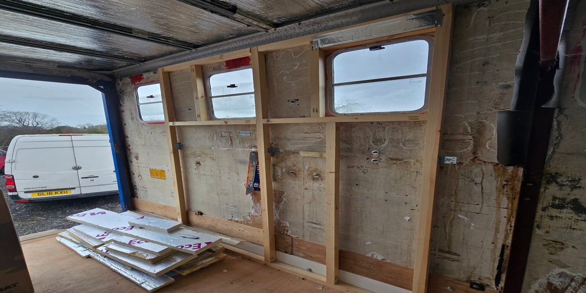 The main walls of the lorry were studded out with 2x2 timbers, fixed and glued to the original walls to give it a bit more strength, and also would accomodate the 50mm Celotex insulation we were going to use.
